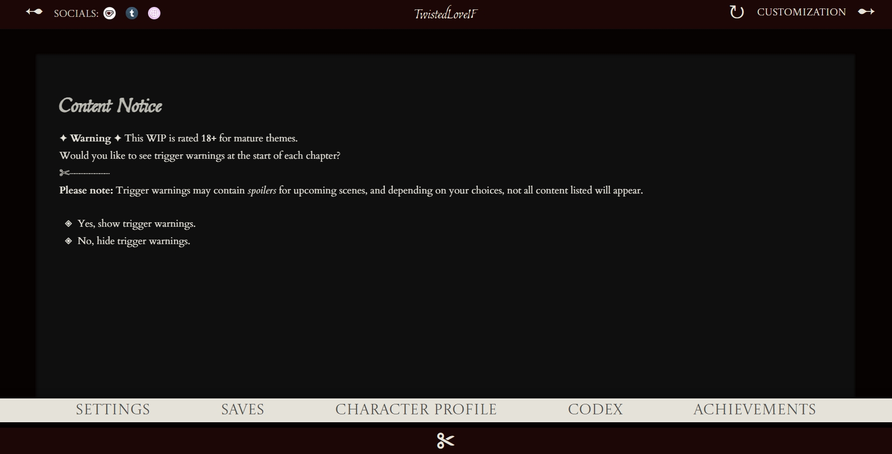 TWISTED LOVE: RED STRING is an 18+ Dark Interactive Fiction.
